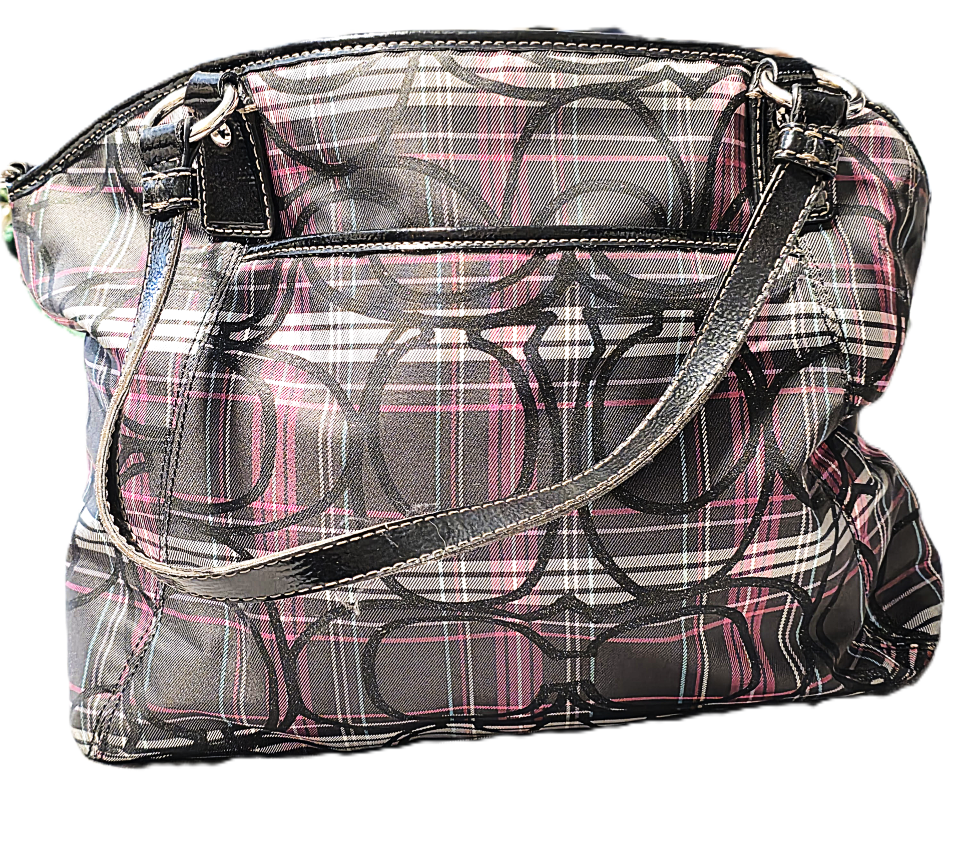 Elegent Coach shoulder bag with vibrant plaid pattern. Features pink and green hues. Ideal for adding a pop of color to your outfit.